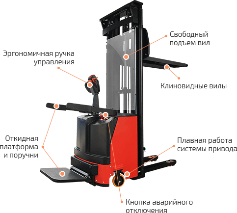 Как и у электрического, у самоходного штабелёра имеются основание, усиленная мачта и две пары вил. Нижняя пара вил оснащена колёсами и подвилочными роликами, чтобы агрегат плавно передвигался по опорной поверхности. Вторая пара вил предназначена для захвата, удержания груза и его подъёма на нужную высоту.